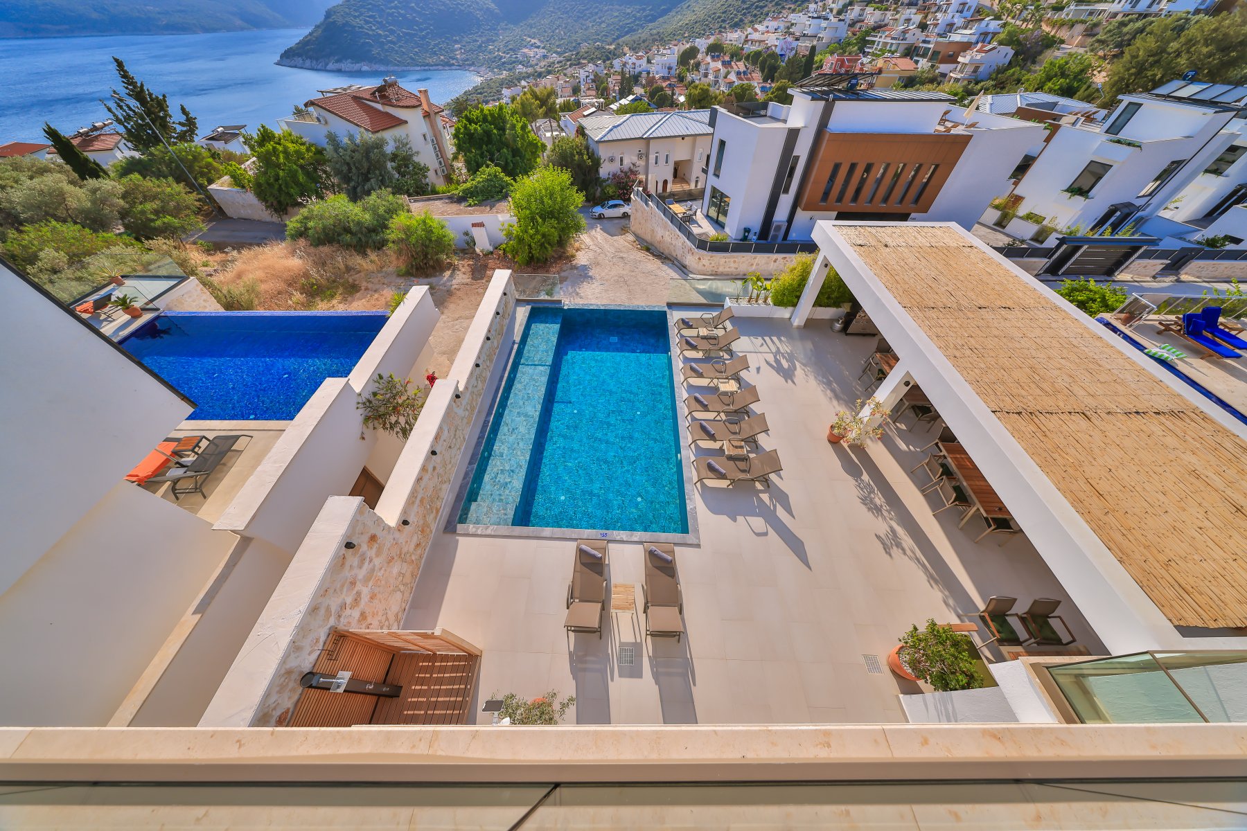 Kalkan’ın plaj kulüplerine, restoranlarına, eski şehir merkezine ve marinaya sadece dakikalar mesafede., Türkiye – İki Havuzlu ve Muhteşem Deniz Manzaralı Yepyeni 7 Yatak Odalı Lüks Villa