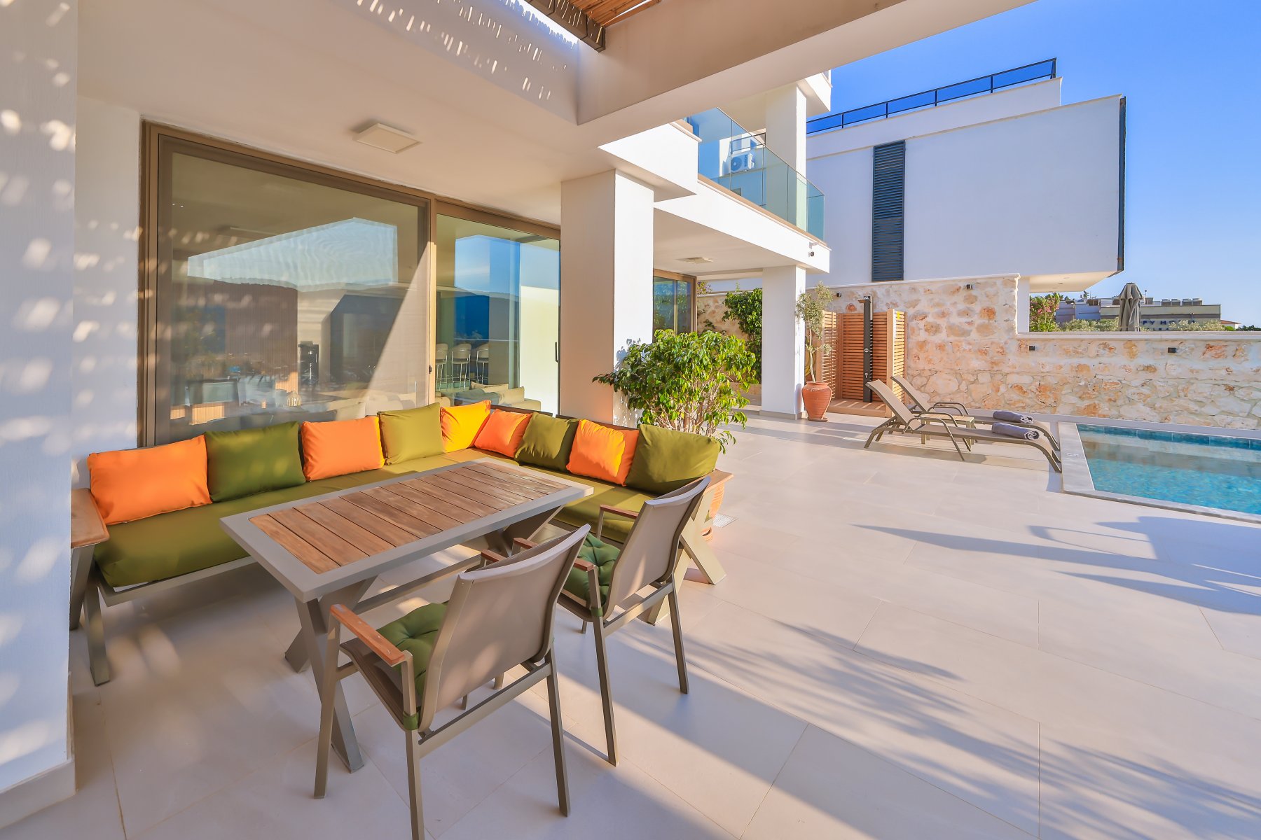 Kalkan’daki özel cennetinizde hoş geldiniz – Akdeniz’in büyüleyici manzaralarına sahip, tamamen yeni inşa edilmiş, daha önce hiç kiralanmamış bu lüks villa; eşsiz bir mahremiyet, konfor ve ferahlık sunuyor.